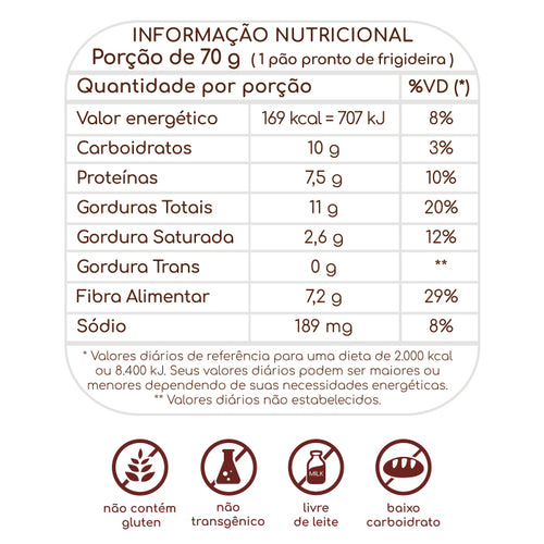 Composto por farinha de castanha de caju, farinha de linhaça dourada, farinha Zaya e fermento químico em pó, é o produto perfeito para quem é adepto da dieta low carb, sem correr risco de contaminação cruzada com qualquer outro ingrediente que não esteja listado.
